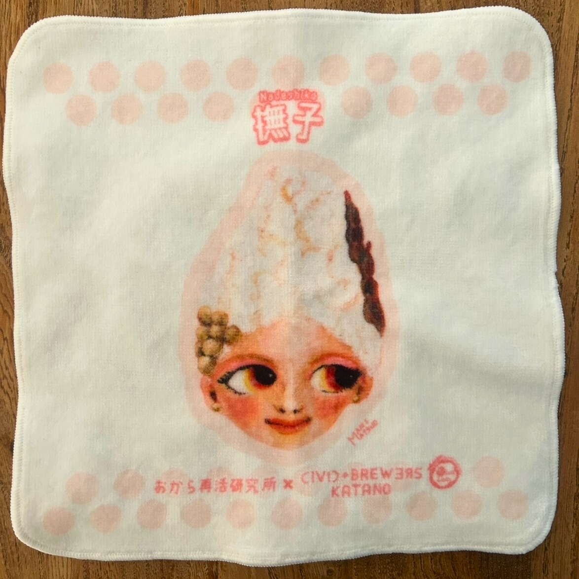 今回タオルを制作したきっかけは、私が関わっているクラフトビールのお披露目会で、来場者に何か渡せるものを用意したいと思ったことです。このビールは“おから再活用研究所” と “CIVIC+BREWERS”さんと共に開発してきたおからのビールです。“撫子の花のように優雅で品のある更年期をめざす方へ”(男女ともに)をコンセプトに開発してきました。元々ご縁があったこともあり、今回お声がけいただき、おからビールのキャラクターでラベルでもあるおからちゃんを使ってハンカチを作成しました。男性にも楽しんでもらえるように考えつつ、ビールと一緒にお披露目会で紹介できるように準備しました。