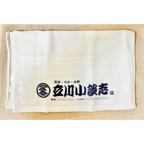 落語会にご来場いただいたお客様へのプレゼントとして制作しました。毎回の公演で季節に合わせた記念品をお渡ししており、その中のひとつとしてタオルを採用しました。他にも、夏場にはうちわ、別の回ではクリアホルダーなど、季節感のあるアイテムを選んでいます。