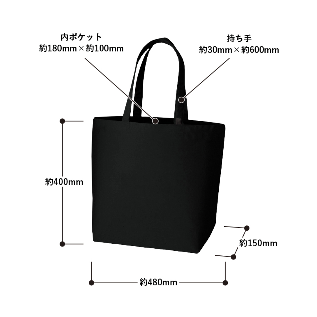 お問い合わせフォームはこちらキャンバストート(L)は12オンスのコットン生地が使用されたインナーポケットとキーホルダーのフック付きのLサイズのトートバッグです。本体サイズは480mm×400mm×150mmです。