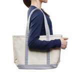 お問い合わせフォームはこちら厚手キャンバスBCトート(M)はハンドルラインにアクセントカラーが施された14オンス厚手コットン生地のマチ付きトートバッグです。本体サイズは470mm×300mm×140mmです。