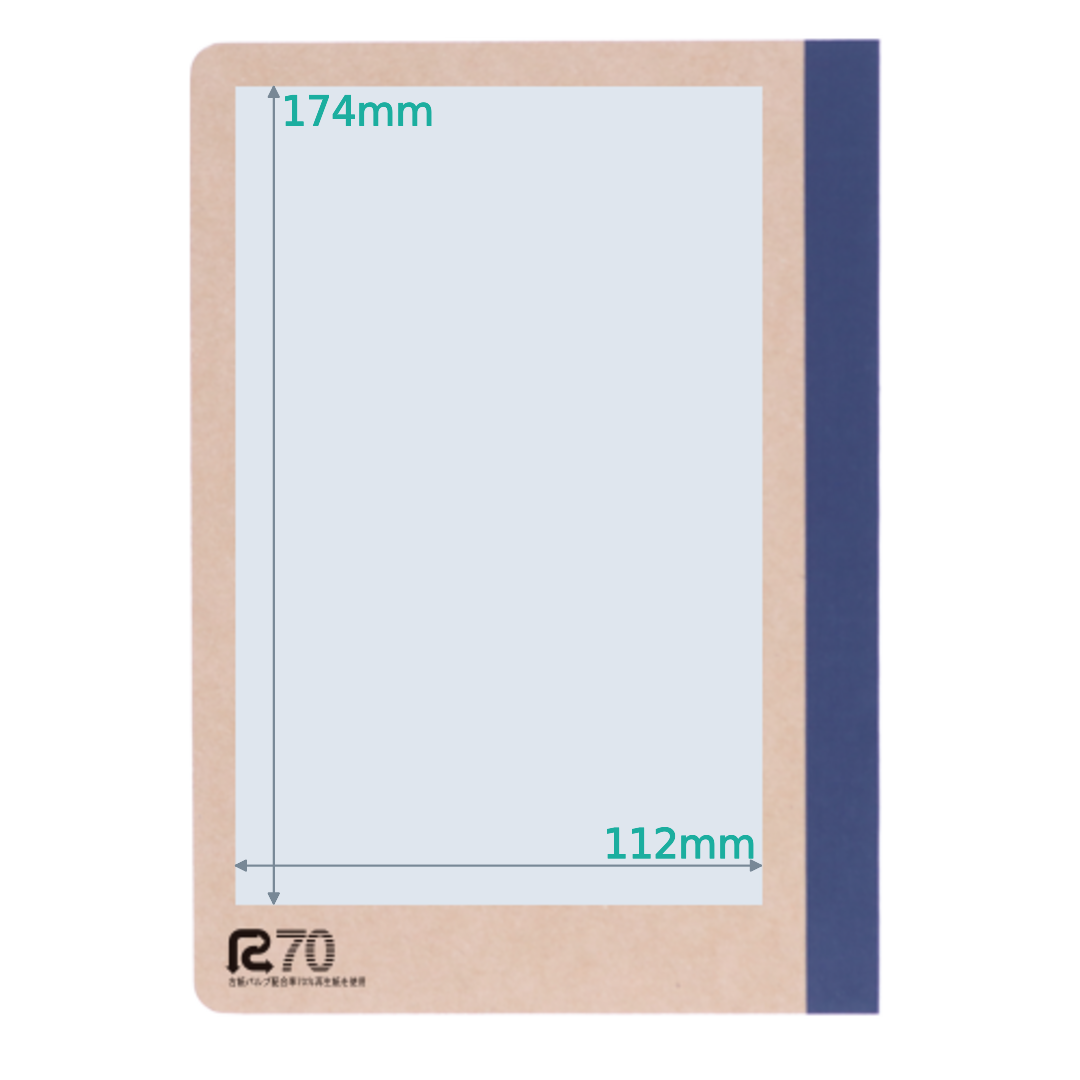 リサイクルA5ノート 6mm罫は、日付も書くことができる罫線付き定番A5ノートです。R70マークを取得しており、古紙パルプ配合率70%の再生紙を使用している商品です。表紙に大きくシルク印刷で名入れ可能です。