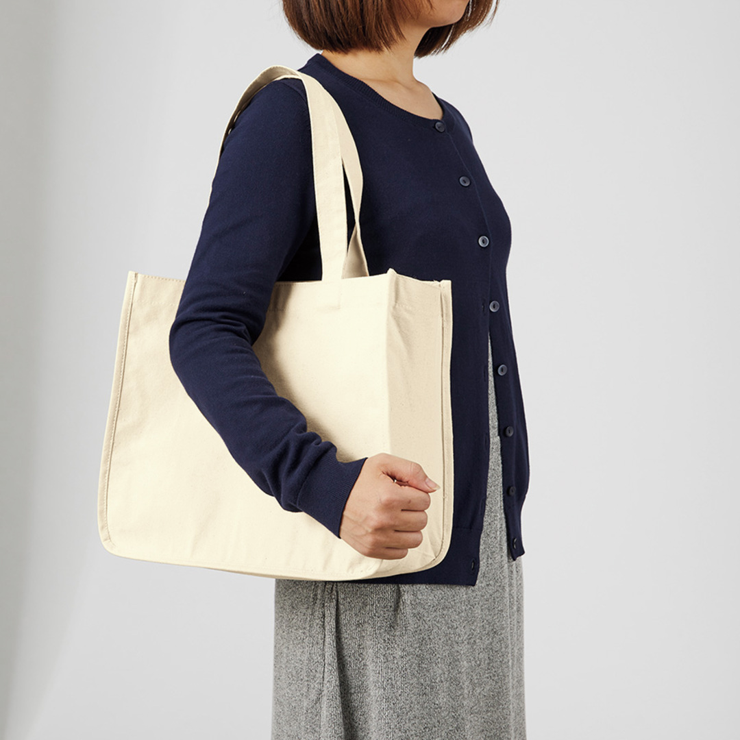キャンバススクエアトートバッグ(M)は12オンスのコットン生地が使用されたトートバッグです。A4サイズが入る容量です。