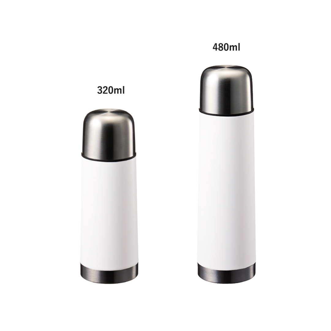 コップ付サーモステンレスボトルは、2色展開で表面マット仕上げのコップ付きのボトルです。本体サイズは直径70mm×193mm、容量320mlのMサイズと、直径70mm×245mm、容量480mlの2種類から選べます。サンプル注文が可能です。