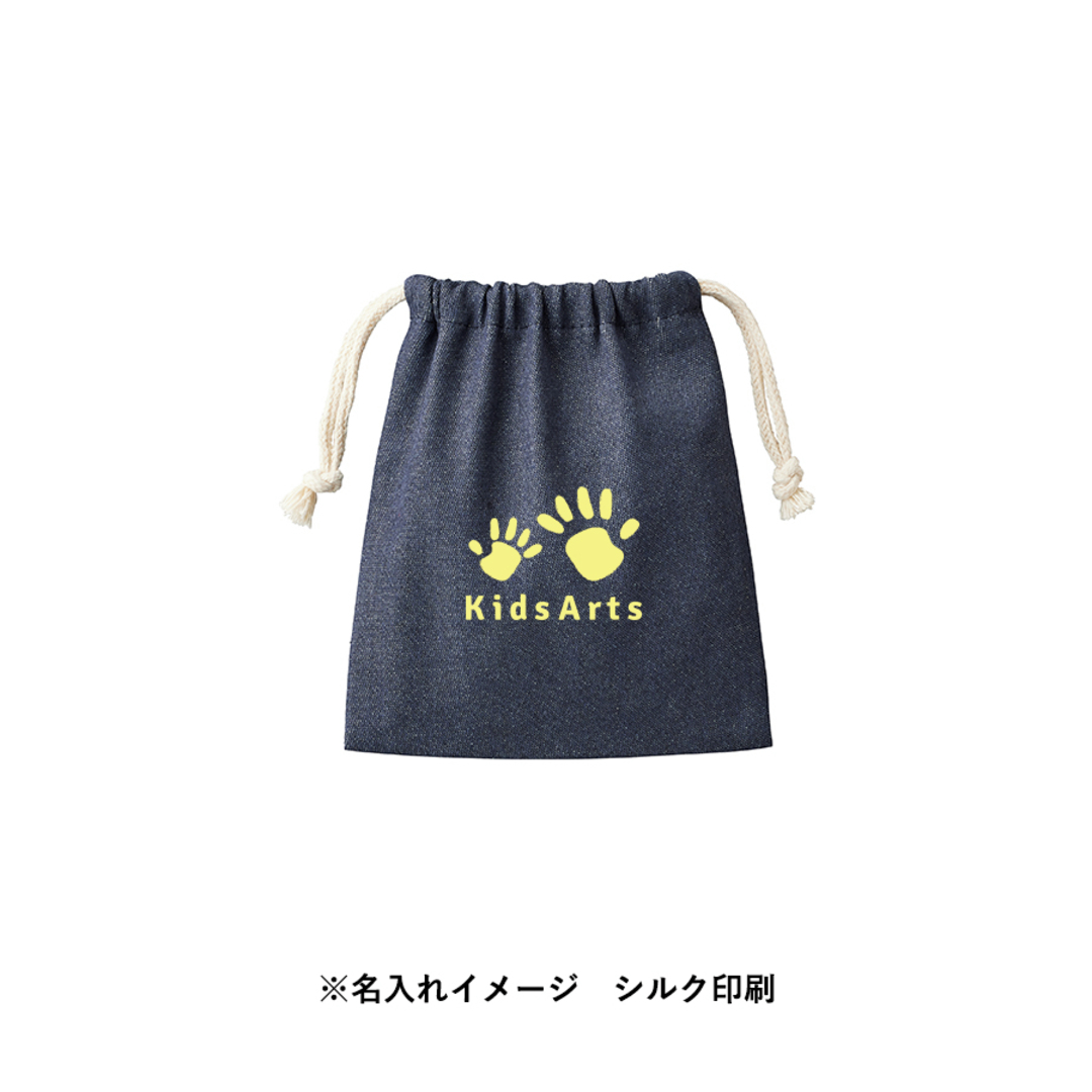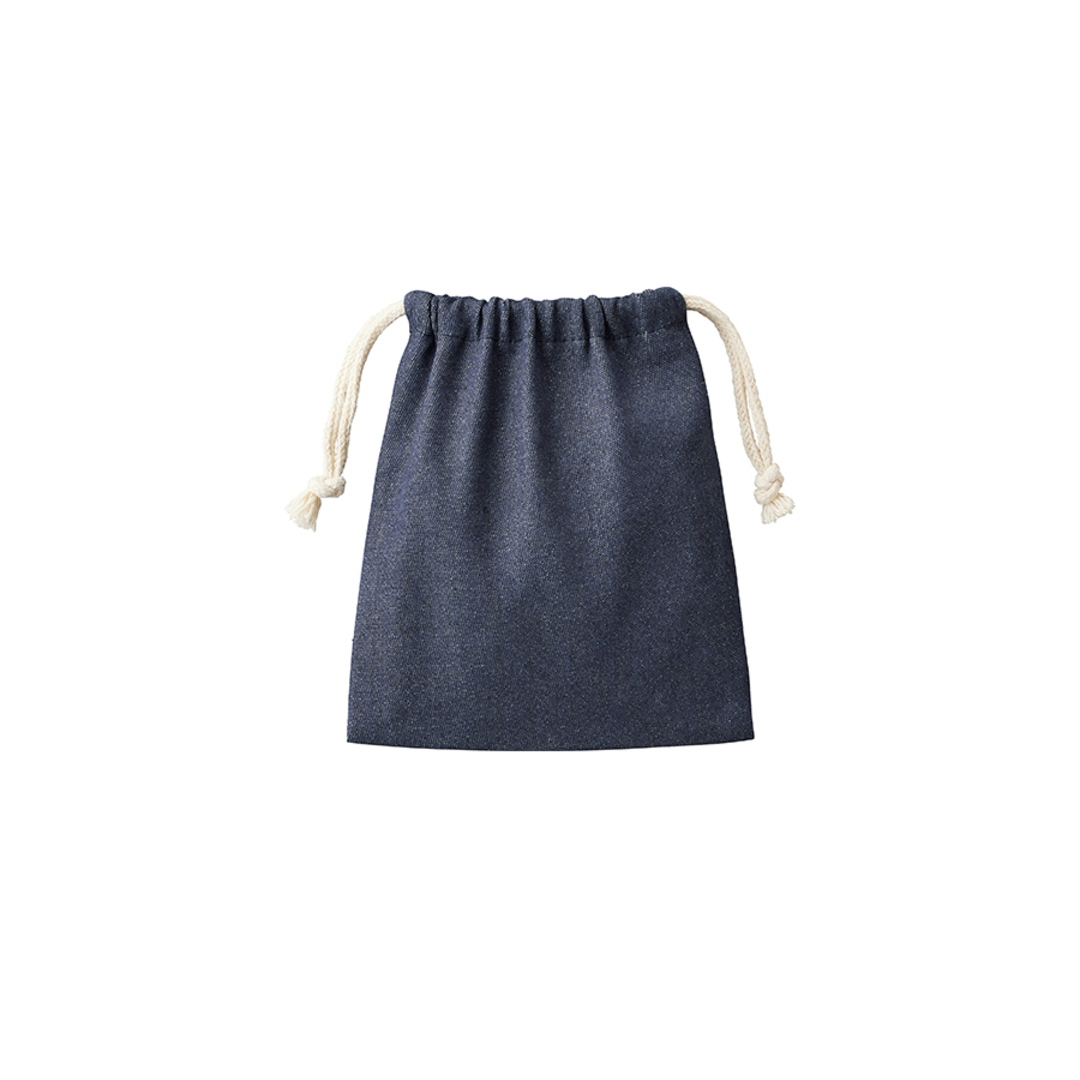 デニムライク巾着(S)は6オンスのアップサイクル(再生素材)デニム風生地が使用されたSサイズの巾着です。本体サイズが180mm×160mmです。