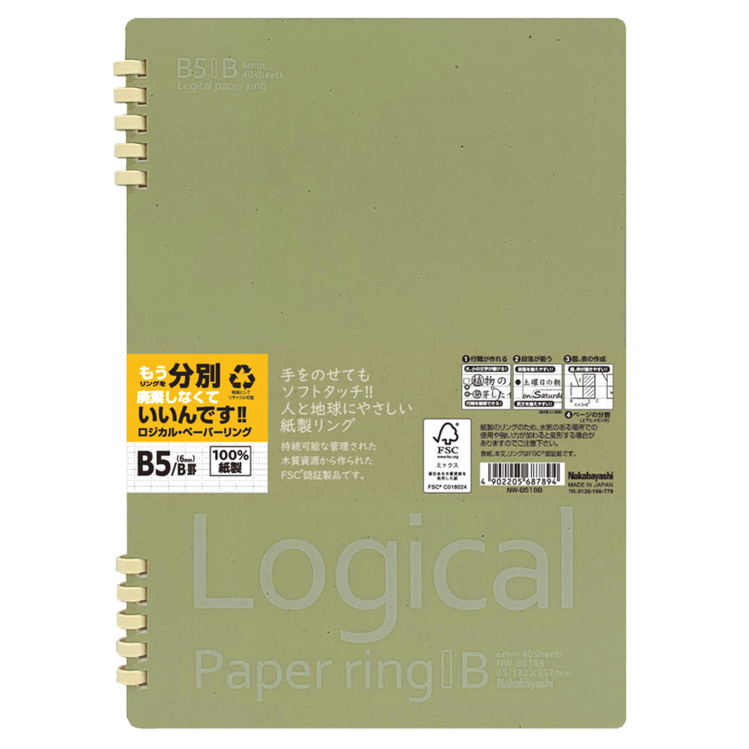 ナカバヤシ ロジカル・ペーパーリングノート B5 6mm罫は、綴じ具が紙でできた100%紙製のリングノートです。本文罫はまとめやすく見やすいロジカル罫を使用しています。全パーツを資源としてリサイクルできる100%紙製の環境配慮型製品です。罫線は6mmです。【FSC® 認証商品】