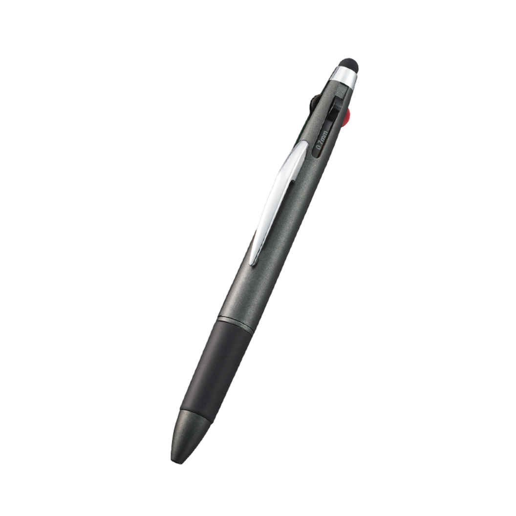 タッチペン付3色+1色スリムペンは、使用頻度の高い黒インクが2本入った黒・赤・青の3色一体になった多色ボールペンです。再生ABSを素材を使用しており、ペン上部にはタッチペンが付いています。