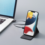 スタンドワイヤレス充電器 5W コンパクトタイプは、スタンド式のワイヤレス充電器です。フラットかつコンパクトなので持ち運びしやすく、天面を立て上げることで簡単にスタンドタイプになります。本体サイズは71mm×116mm×13mmです。