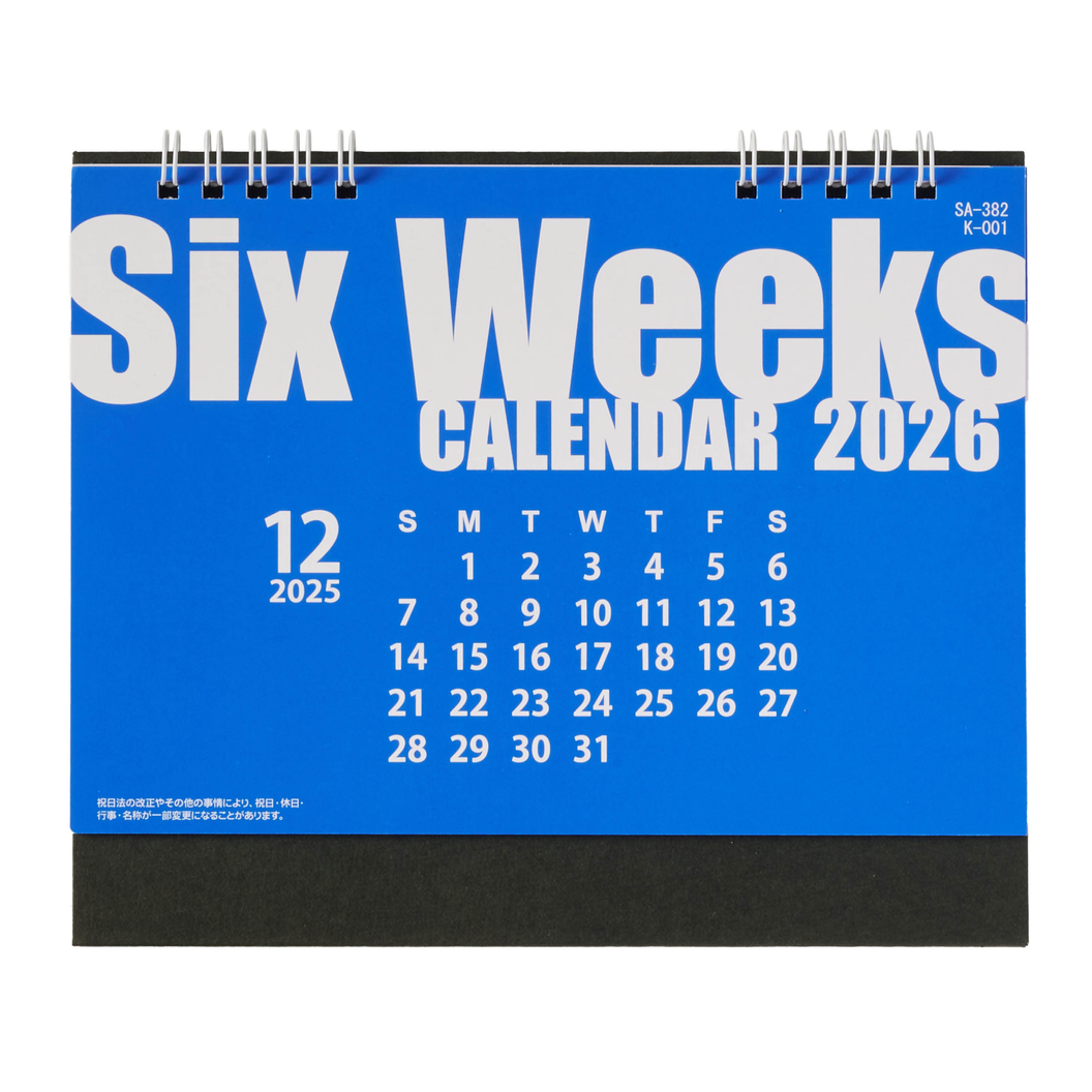 お問い合わせフォームはこちら卓上シックスウィークス SA-382は、ブルーのフォントカラーが見やすいデザインで実用性に優れた卓上カレンダーです。 裏面にはスケジュール管理に便利なメモスペースと、6ヶ月のカレンダー表示があります。 12月の裏面はテレフォンメモ付き。 短納期出荷の指定が可能な商品です。
