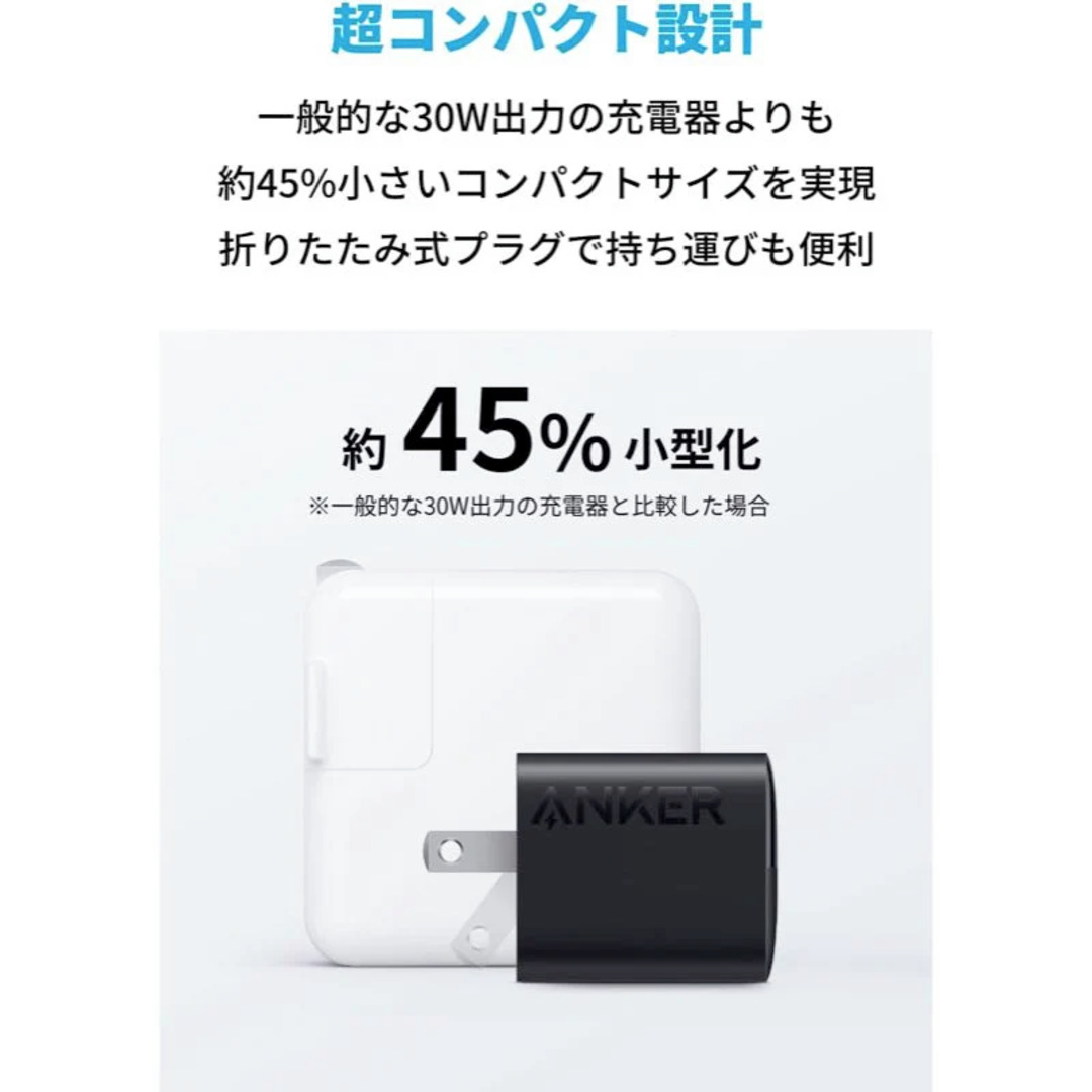 お問い合わせフォームはこちらAnker 323Charger 急速充電器 33W 2ポート USB-A・Type-Cは、一般的な30W出力以上の充電器に比べ、約45%小さい充電器です。 USB-AポートとUSB-Cポートを搭載。USB-CポートはUSB PDに対応し、単ポート利用時はMAX 33Wの出力でiPhoneやMacBook Airに急速充電が可能です。(本製品にはモバイルバッテリー機能はございません。) 2ポート利用時でもUSB-Aポートから12W、USB-Cポートから20Wの出力で、お使いのスマートフォンとタブレット端末などを同時に充電することが可能です。 折りたたみ式プラグを採用し、どこにでも気軽に持ち運ぶことができます。 iPhoneなどのスマートフォンだけでなく、タブレット端末やMacBook Airなど、幅広い機器に対応しています。 ※ケーブルは別売りです