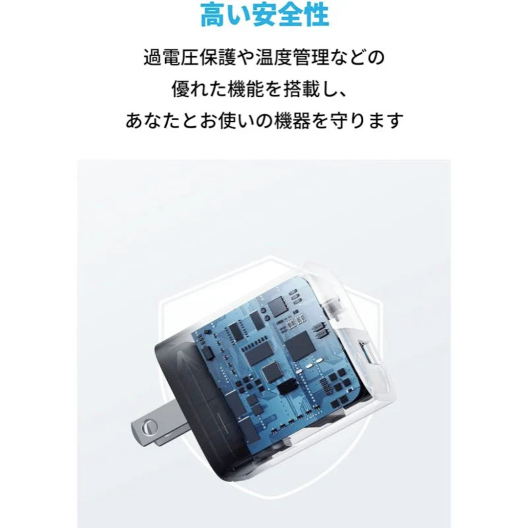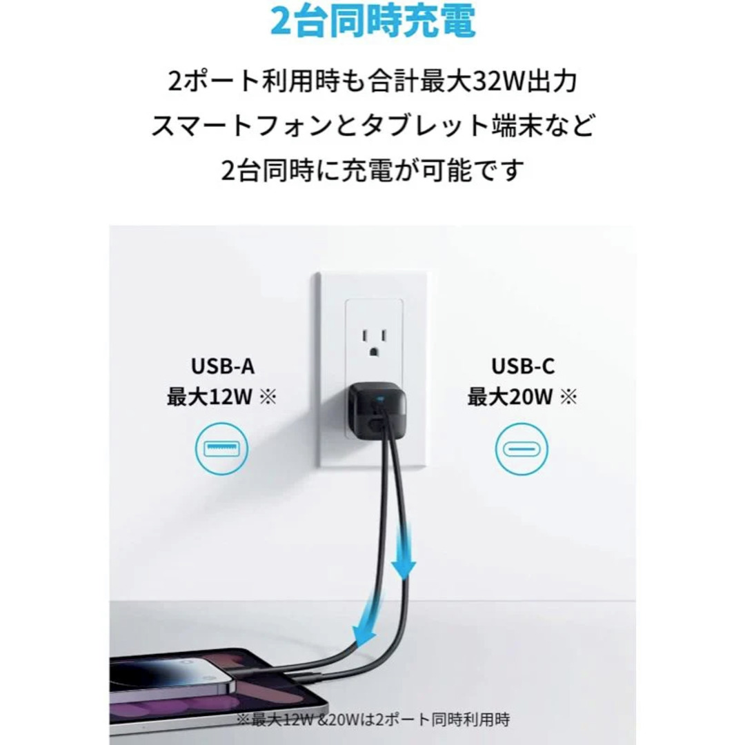 Anker 323Charger 急速充電器 33W 2ポート USB-A・Type-Cは、一般的な30W出力以上の充電器に比べ、約45%小さい充電器です。 USB-AポートとUSB-Cポートを搭載。USB-CポートはUSB PDに対応し、単ポート利用時はMAX 33Wの出力でiPhoneやMacBook Airに急速充電が可能です。(本製品にはモバイルバッテリー機能はございません。) 2ポート利用時でもUSB-Aポートから12W、USB-Cポートから20Wの出力で、お使いのスマートフォンとタブレット端末などを同時に充電することが可能です。 折りたたみ式プラグを採用し、どこにでも気軽に持ち運ぶことができます。 iPhoneなどのスマートフォンだけでなく、タブレット端末やMacBook Airなど、幅広い機器に対応しています。 ※ケーブルは別売りです