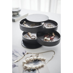 アクセサリーを傷つけないフェルトマット付き。トレーは回転式になっているので、必要な段のトレーをスライドさせれば取りたい物が簡単に取り出せます。使わない時はトレーの部分を重ねてコンパクトに。アクセサリーをはじめ、コスメや腕時計など毎日身に付ける小物の収納に最適です。回転式で取り出しやすい美しいフォルムのアクセサリートレー。