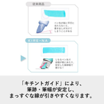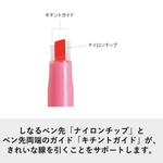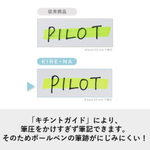 パイロット KIRE-NA キレーナ 蛍光ペンは、まっすぐきれいな線がひける、新開発「キチントガイド」機能つきの蛍光ペンです。 「キチントガイド」が紙面に当たることで筆跡や筆幅が安定し、教科書やノートの曲面でも、まっすぐで美しい線を引くことができます。また、ペン先に過剰な筆圧がかかりにくいため、シャープペンシルやボールペンなど、下の文字がにじみにくいのも特長です。 さらに、ナイロンチップが書き終わりのインキ溜まりをスポンジのように吸収し、線の終わりが濃くなりにくく、裏抜けも抑えられます。 コピー用紙なら約1秒で乾く速乾顔料インキを採用しており、手や筆記面を汚しにくい仕様です。