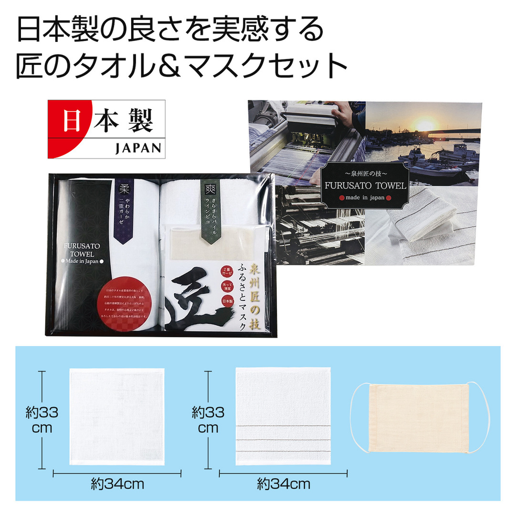 | 本体サイズ | パイルウォッシュタオル/約34×33cm 二重ガーゼウォッシュタオル/約34×33cm ふるさとマスク/約17.5×12cm |