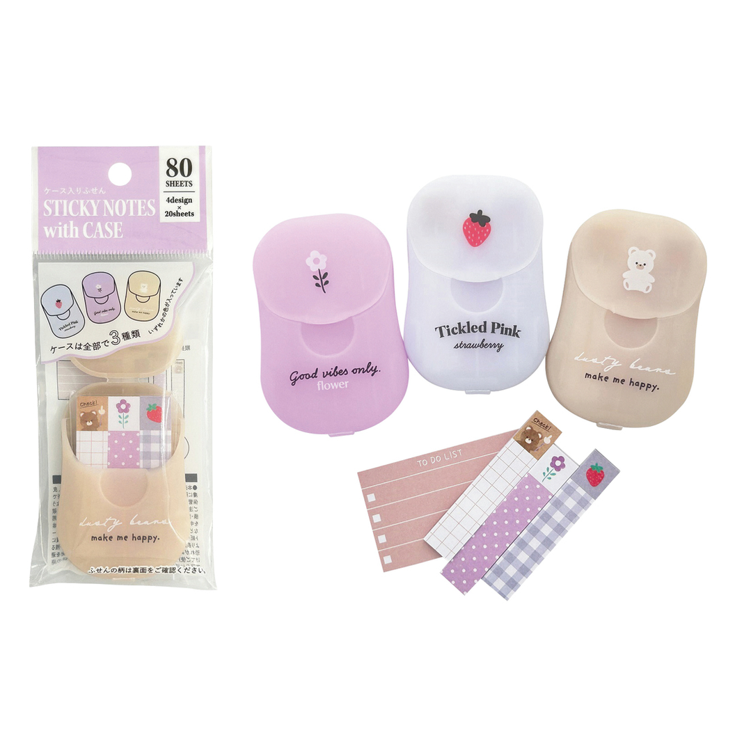 かわいいプラケースに2サイズの付箋をセットしました。セットの付箋は33×55mmが20枚と55×11mmが3柄各20枚の計80枚入。持ち運びに便利な商品です。