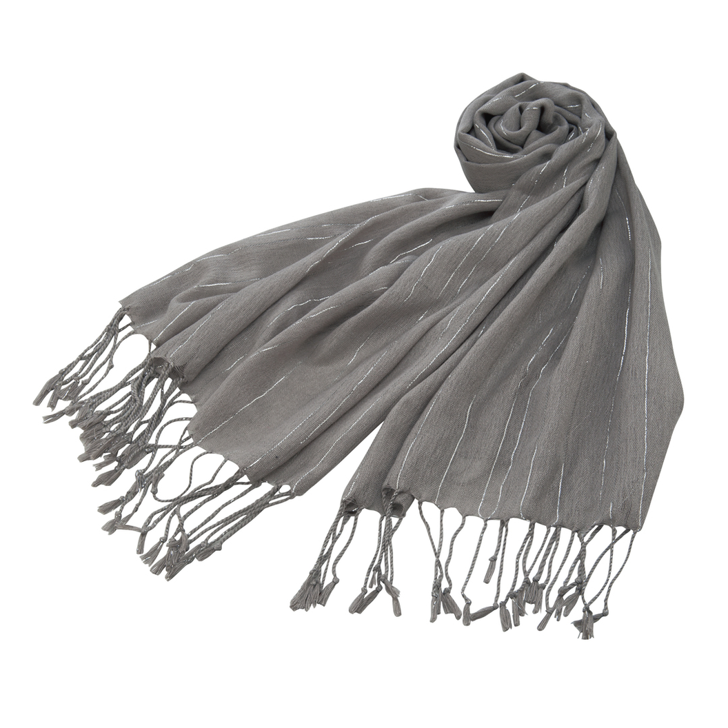 お問い合わせフォームはこちら上品さの中で、きらめきも忘れない。3シーズンで羽織れるストール。ランダムにきらめくシルバーのラメストライプが、暗くなりがちな秋冬のコーディネートに華を添えてくれます。