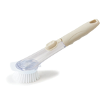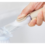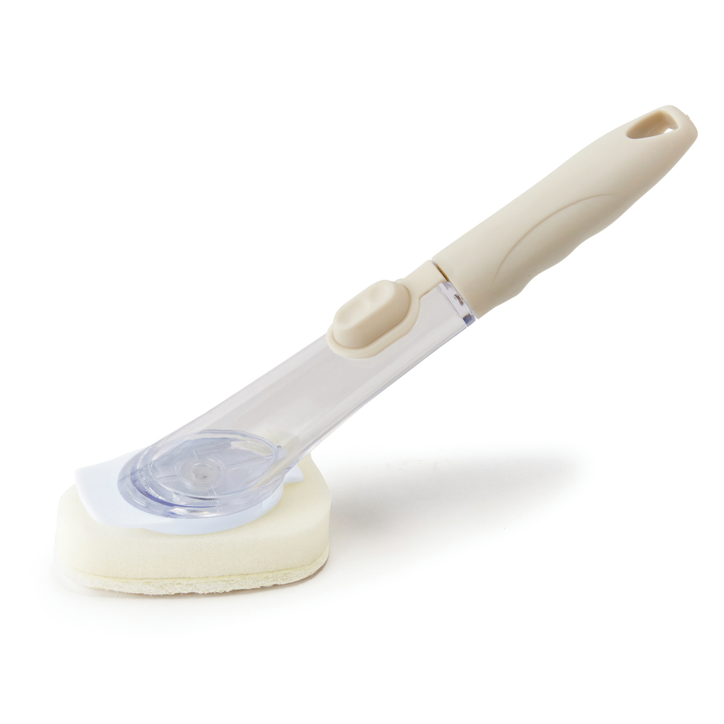 ボタン一押しでハンドル内に入れた洗剤が出てくる便利なお掃除ツール。洗い物中に洗剤を追加する際も持ち替えの手間がなく便利です。付け替え可能なブラシとスポンジが付属し、食器やシンクなどさまざまな場所で活躍します。直接手を濡らさず作業でき、洗剤や冷水による手荒れ防止にも効果的。キッチンでの水仕事がぐんと楽になる実用的なツールです。