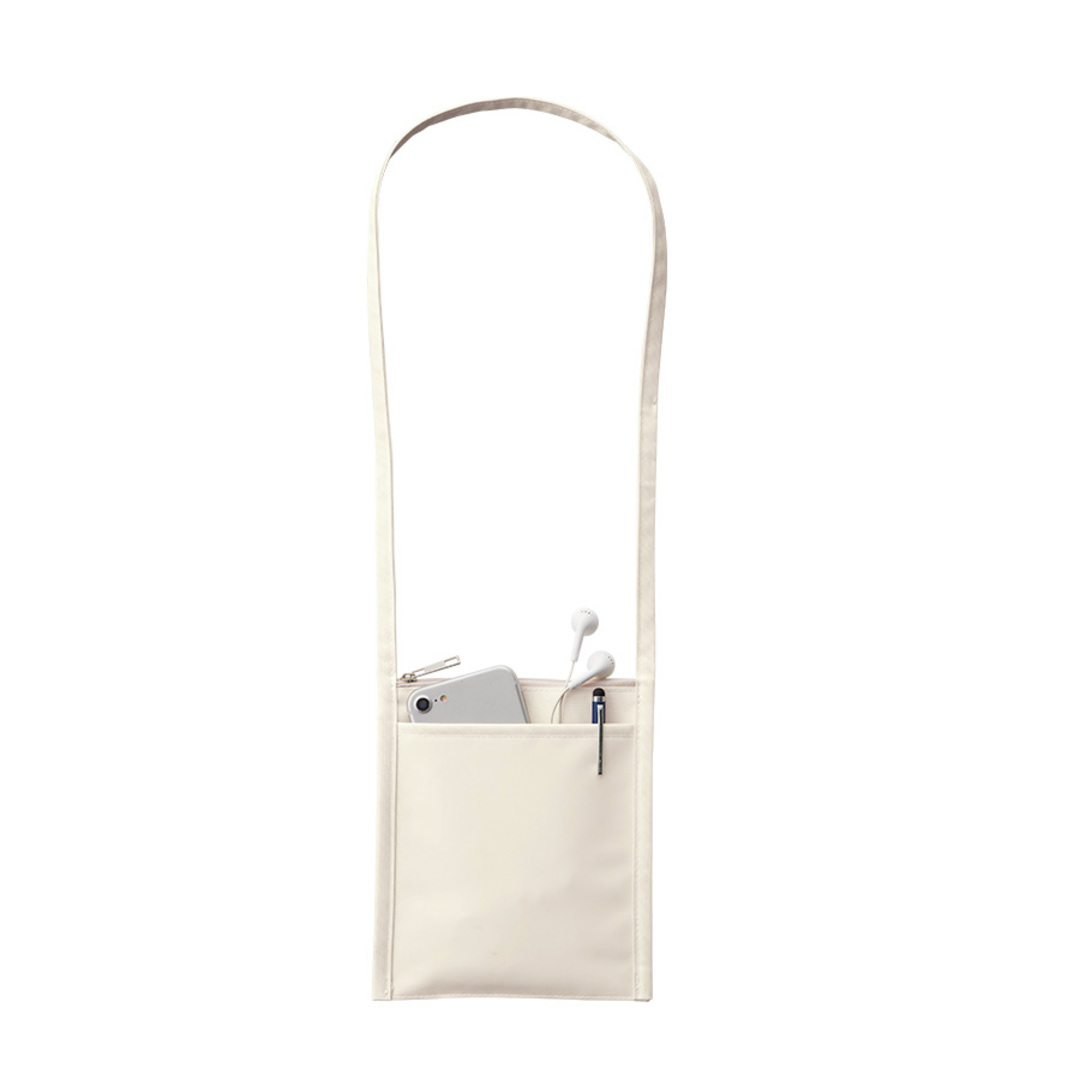 フロントポケットミニサコッシュは目が細かく高級感のあるポリエステル生地が使用されたサコッシュです。口元がファスナーで開閉できるポケットが付いています。