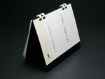 B6サイズ リング式カレンダー 卓上 R-101C-BKは、大きくて見やすいB6サイズのため、予定を書き込みやすい卓上カレンダーです。裏面には便利なメモ機能が付いています。 リング部分は環境に優しい生分解性材料を利用しています。台紙を折り曲げるだけの簡単組み立てです。黒い台紙なので名入れが映えます。