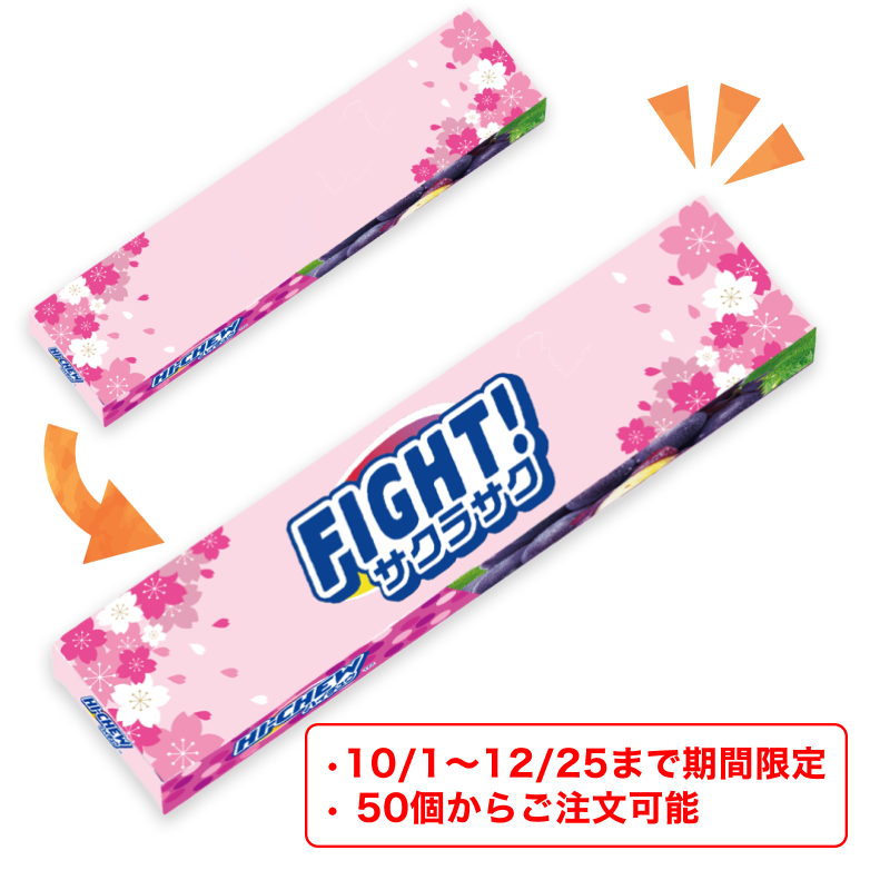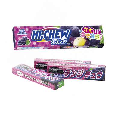 お問い合わせフォームはこちらフルーツのジューシーな味わいと、噛み応えのある独自食感で、手軽に日常のワクワク感を創出するソフトキャンディです。 ※本商品は期間限定で小ロット(50個)からご注文いただくことが可能です。期間終了後には増刷注文およびご注文をいただくことはできません。 ※また、通常商品(オリジナルハイチュウ(グレープ))含め他商品へデザインの流用はできません。あらかじめご了承ください。