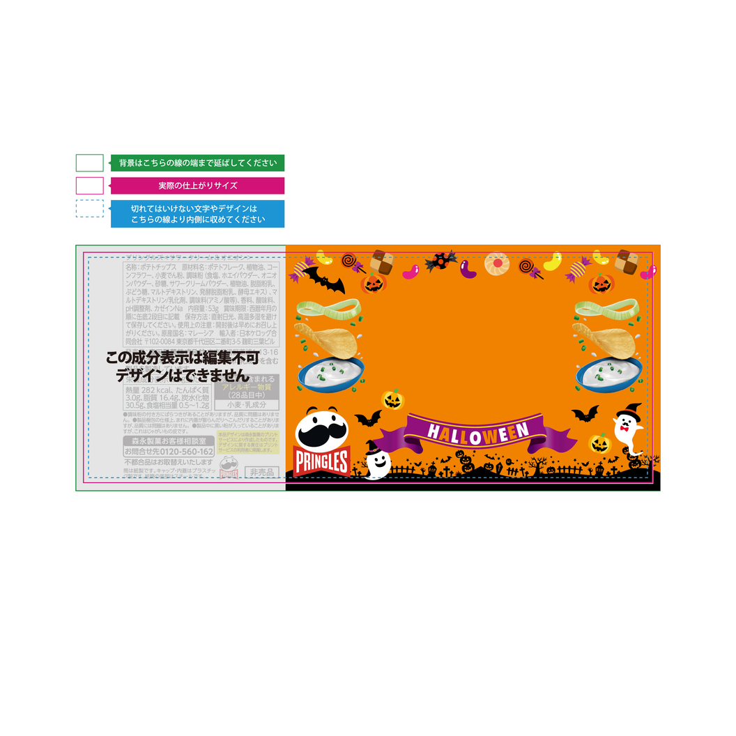 酸味・サワークリーム・塩味・オニオンなどの味の要素の全体的なバランスを整えたプリングルズらしいユニークな味わい。オニオンの深い味わいとクリーミーさがアップした、クセになる味です。通常のプリングルズ の胴巻きされたデザインに、お客様のデザインされたオリジナルシールを貼付した仕様となっております。 内容量はそのままでお渡ししやすいコンパクトサイズとなりました! 缶サイズの変更に伴い、印刷範囲も変更されておりますのであらかじめご了承ください。 ※本商品は期間限定で小ロット(48個)からご注文いただくことが可能です。期間終了後には増刷注文およびご注文をいただくことはできません。 ※また、通常商品(オリジナルプリングルズ(サワークリーム&オニオン) 【新パッケージ】)含め他商品へデザインの流用はできません。あらかじめご了承ください。
