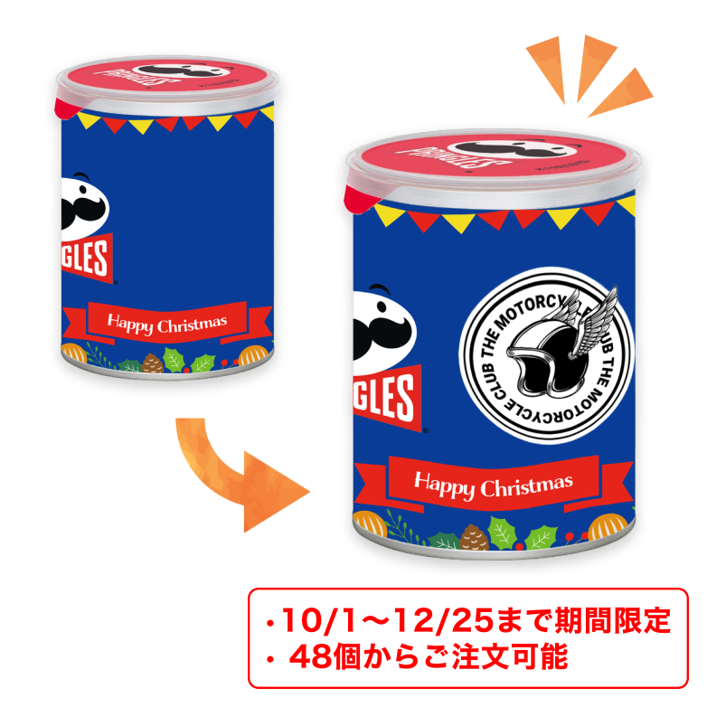 酸味・サワークリーム・塩味・オニオンなどの味の要素の全体的なバランスを整えたプリングルズらしいユニークな味わい。オニオンの深い味わいとクリーミーさがアップした、クセになる味です。通常のプリングルズ の胴巻きされたデザインに、お客様のデザインされたオリジナルシールを貼付した仕様となっております。 内容量はそのままでお渡ししやすいコンパクトサイズとなりました! 缶サイズの変更に伴い、印刷範囲も変更されておりますのであらかじめご了承ください。 ※本商品は期間限定で小ロット(48個)からご注文いただくことが可能です。期間終了後には増刷注文およびご注文をいただくことはできません。 ※また、通常商品(オリジナルプリングルズ(サワークリーム&オニオン) 【新パッケージ】)含め他商品へデザインの流用はできません。あらかじめご了承ください。