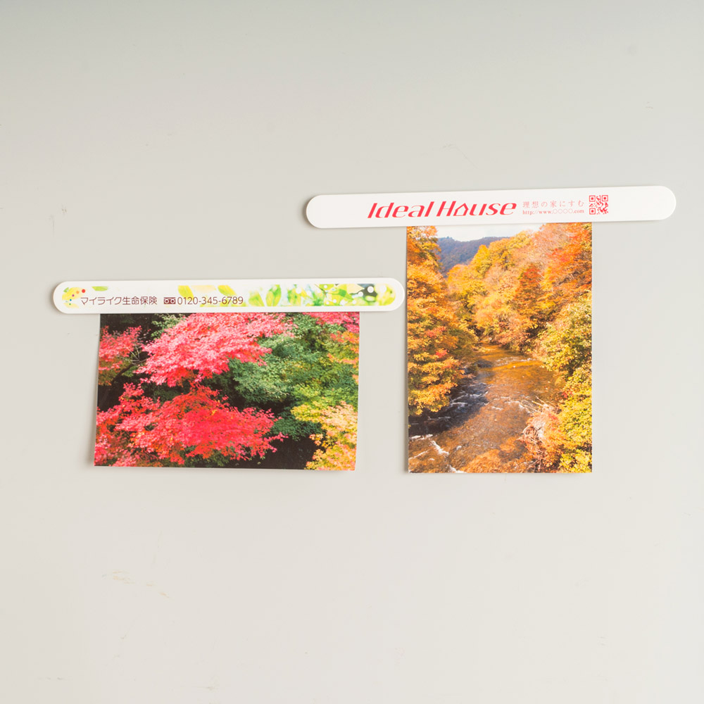 バータイプマグネットは最もポピュラーなタイプのプラスチックマグネット広告です。 裏に付いている磁石の磁力で、冷蔵庫に押し付けて紙を挟んで止める機能を持つタイプになります。 横長の広告スペースに会社名・店名と電話番号等をオリジナル名入れ印刷ができ、軽量で配布時などに持ち運びに便利で、 ノベルティ・粗品として広く使用されているオリジナルマグネットです。