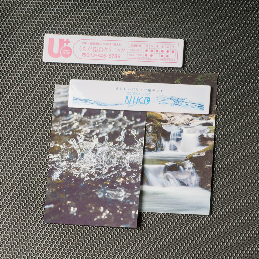 バータイプマグネットは最もポピュラーなタイプのプラスチックマグネット広告です。 裏に付いている磁石の磁力で、冷蔵庫に押し付けて紙を挟んで止める機能を持つタイプになります。 横長の広告スペースに会社名・店名と電話番号等をオリジナル名入れ印刷ができ、軽量で配布時などに持ち運びに便利で、 ノベルティ・粗品として広く使用されているオリジナルマグネットです。