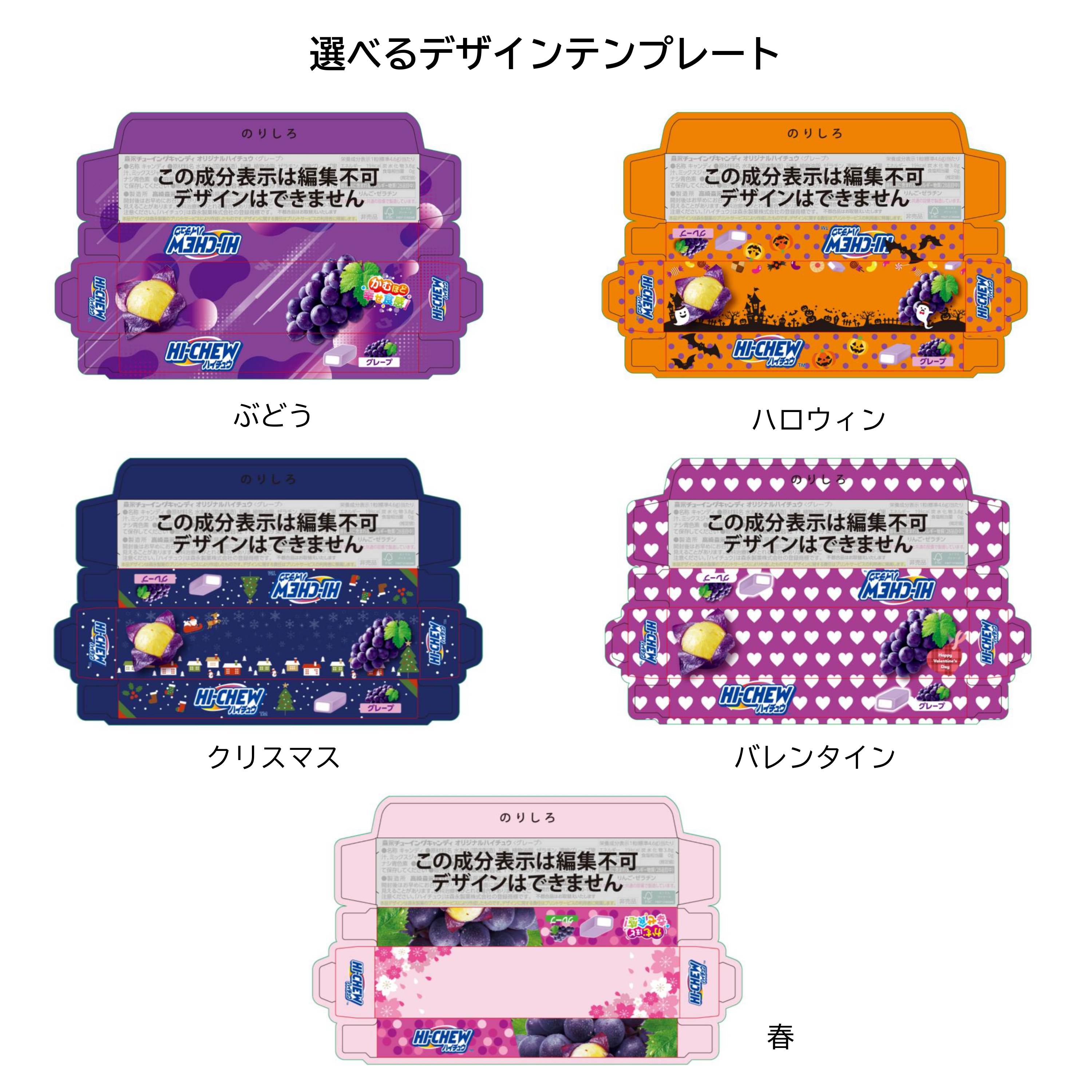 お問い合わせフォームはこちら子供から大人まで愛される森永製菓のロングセラーソフトキャンディ菓子「ハイチュウ」をオリジナルデザインで作ることができます。外側のパッケージのデザインを自由にカスタマイズすることができ、中身は密封包装されたハイチュウが入っています。味は一番人気のグレープ味となります。 ※2025年11月3日(月)までに配布していたテンプレートは旧サイズのためご利用をお控えください ※新サイズのテンプレートは上記"テンプレートをダウンロード"からダウンロードいただけます ※デザインやサイズ調整はお客様のお手元でご入稿前にご調整ください