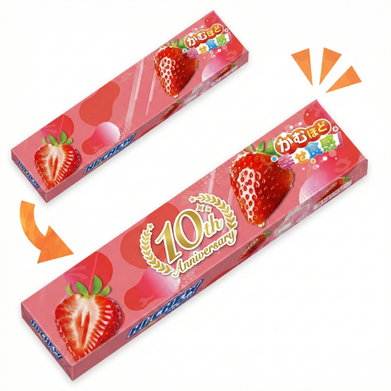 フルーツのジューシーな味わいと、噛み応えのある独自食感で、手軽に日常のワクワク感を創出するソフトキャンディです。果実ピューレを練り込み、 ジューシーなおいしさがUP! ※2025年11月3日(月)までに配布していたテンプレートは旧サイズのためご利用をお控えください ※新サイズのテンプレートは上記"テンプレートをダウンロード"からダウンロードいただけます ※デザインやサイズ調整はお客様のお手元でご入稿前にご調整ください