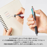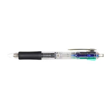 シンプルなクリアボディの4色ボールペンです。 ペン先のカラーは使用頻度の高いブラック・レッド・ブルーの3色に加え、アクセントになるグリーンを足した4色です。 天面ノックを押すと簡単に芯がしまえる仕組みで使い勝手もばっちりです。 多色ペンの中でもリーズナブルなため、おくばり案件などにもおすすめです。 本体にフルカラー印刷が可能なため、企業ロゴや学校ロゴをいれれば説明会やオープンキャンパスなどのノベルティとしてご提案いただけます。