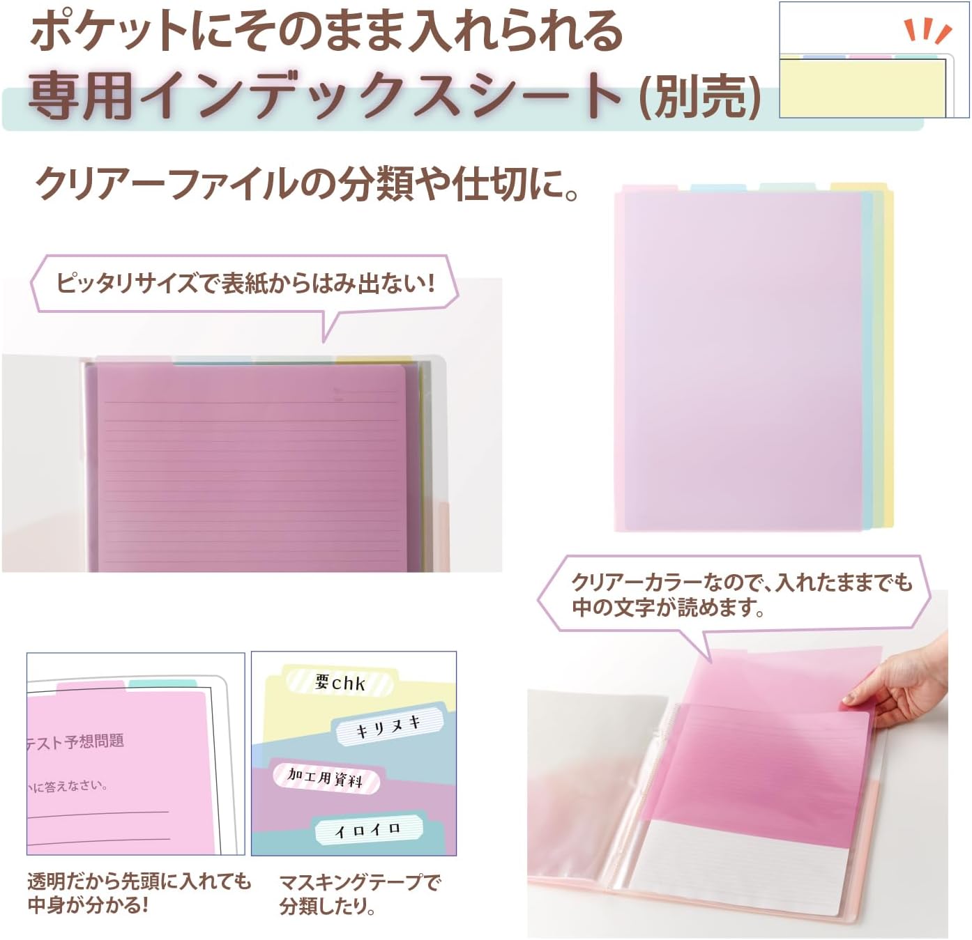 お問い合わせフォームはこちら★ポケット数:10ポケット★好きな色で毎日を楽しい気分に!Pastel color(パステルカラー)のクリアーファイル Pasty(パスティ)★持ち運びや、とりまとめに便利な3つの外ポケット付き★中ポケットの溶着位置を下げた独自設計[アンダー溶着]で中身のはみ出しも表紙がガード★ポケット表面の特殊加工で滑りやすく開きやすい。強めのシボ加工で出し入れのストレス軽減★角丸設計でバッグを気づ付けにくい。毎日使うからこそ優しい仕様に★外側は傷が目立ちにくいシボ加工。内側はふせんなどを貼りやすい鏡面加工