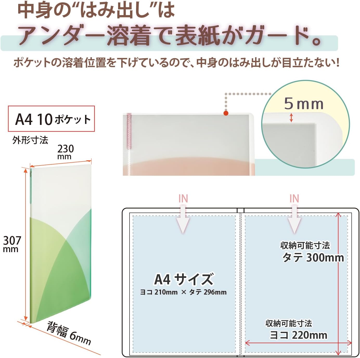 | 素材 | 材質:ポリプロピレン(表紙シートの厚み0.5mm、表紙外ポケットシートの厚み0.2mm、ポケットフィルムの厚み0.04mm) |