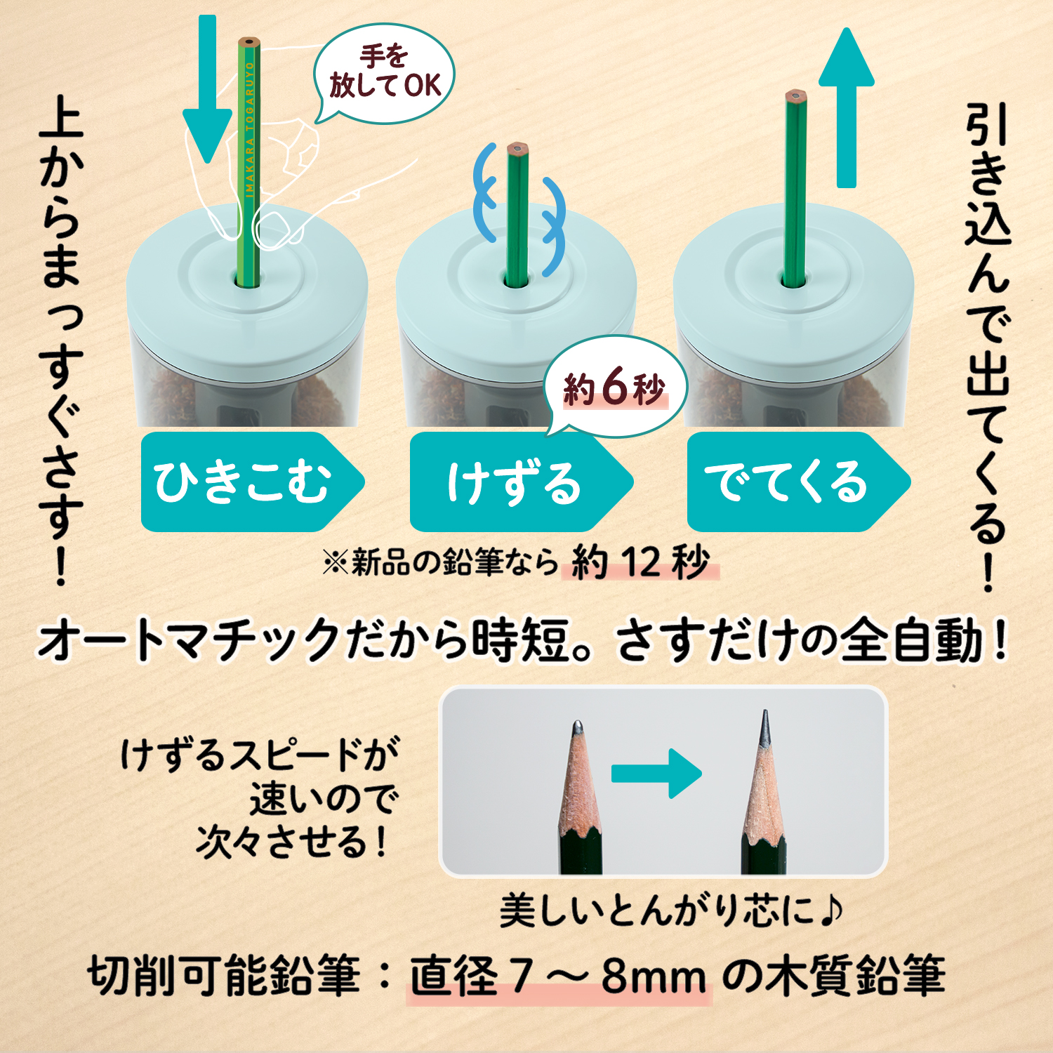 オートマチックだから時短!鉛筆を差し込むだけ!削り終わったら自動的に出てくる!★充電式だから煩わしさ無し!電池の取り換えが不要。コードが無いので、置き場所自由。持ち運びも、簡単にできる★コードが取り外し可能なため、鉛筆の削りカスが捨てやすい。