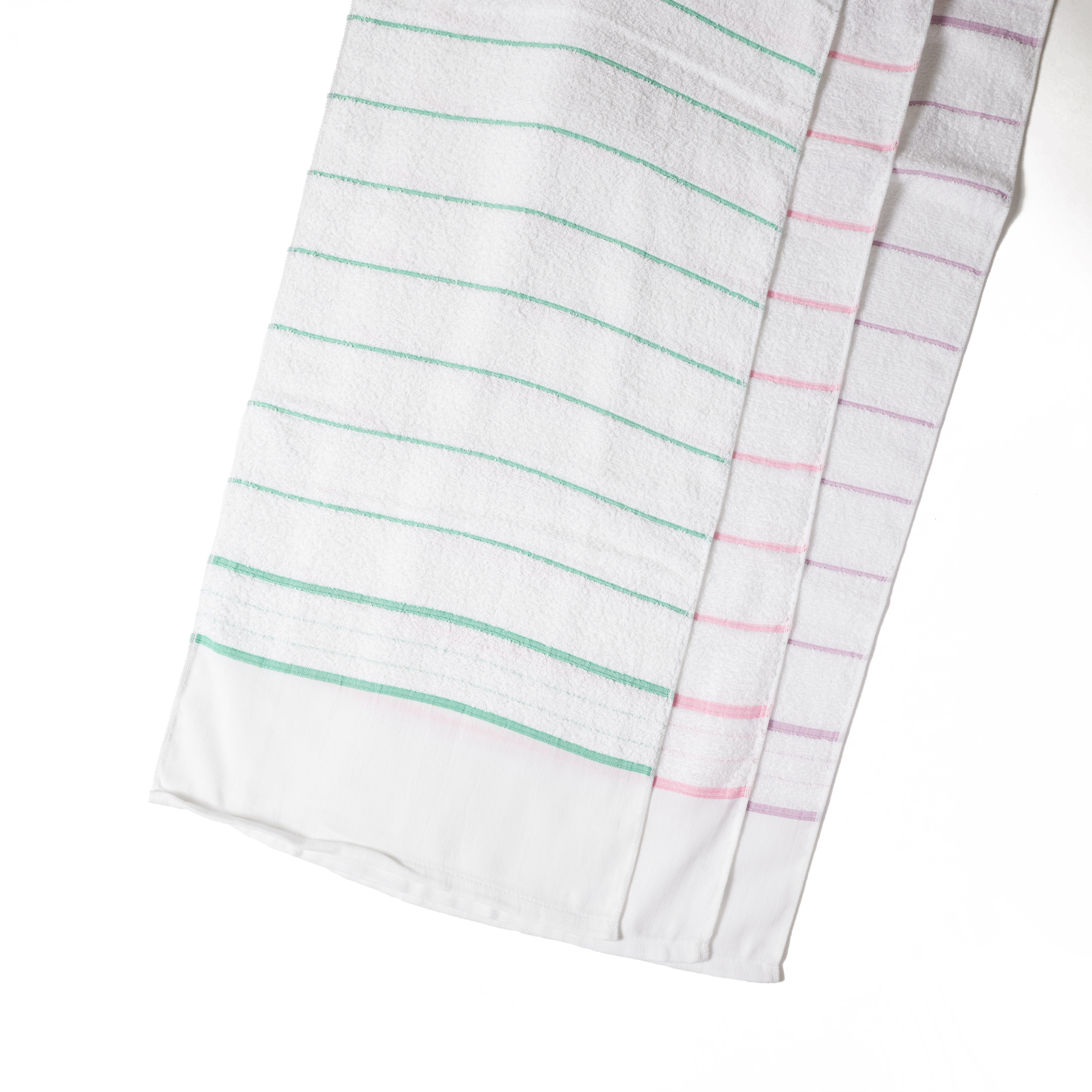 ファッションライン柄国産タオル 3色セット 200匁は、本体サイズが約34×82cmの薄手のカラータオルです。ピンク、パープル、グリーンの3色展開です。