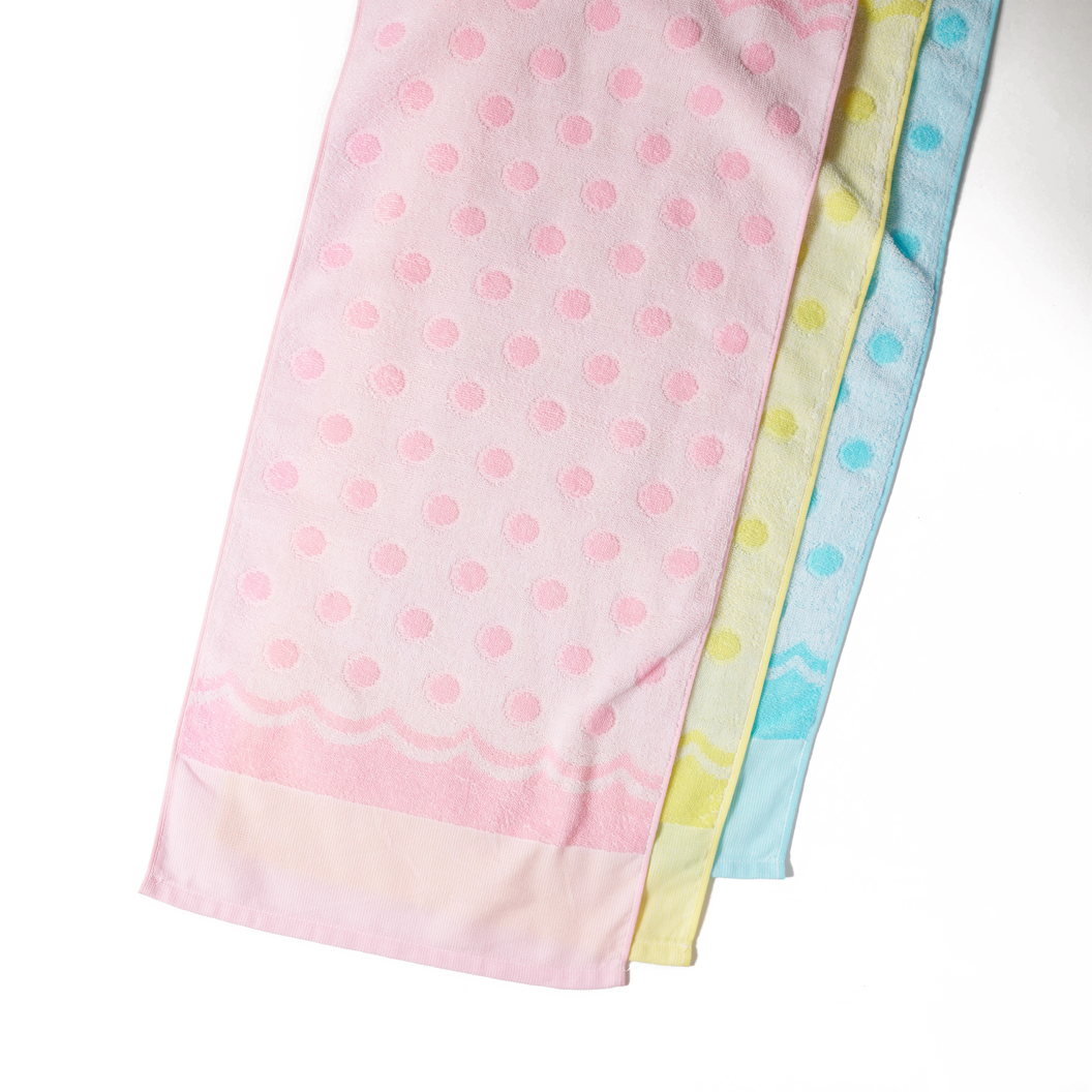シャボン柄国産タオル 3色セット 220匁は、本体サイズが約34×86cmのやや薄手のカラータオルです。ブルー、イエロー、ピンクの3色展開です。