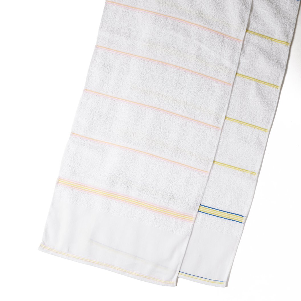 お問い合わせフォームはこちらコスモライン柄国産タオル 2色セット 220匁は、本体サイズが約34×87cmのやや薄手のカラータオルです。ブルー系、ピンク系の2色展開です。