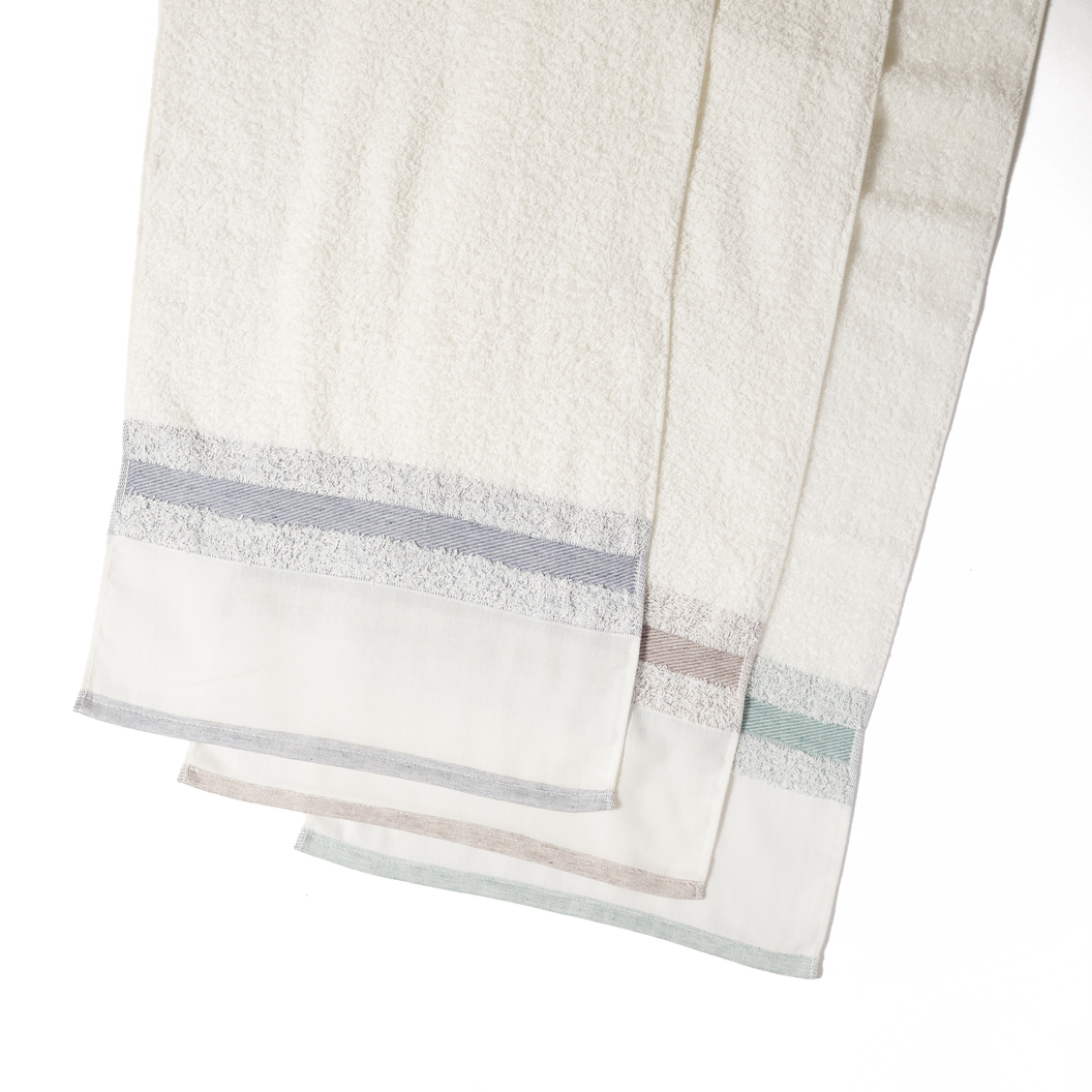 お問い合わせフォームはこちらリサイカラー柄国産タオル 3色セット 220匁は、本体サイズが約34×85cmのやや薄手のカラータオルです。リサイクルコットンを使用したSDGs対応のエコ商品です。オリーブ、シナモン、アッシュグレーの3色展開です。