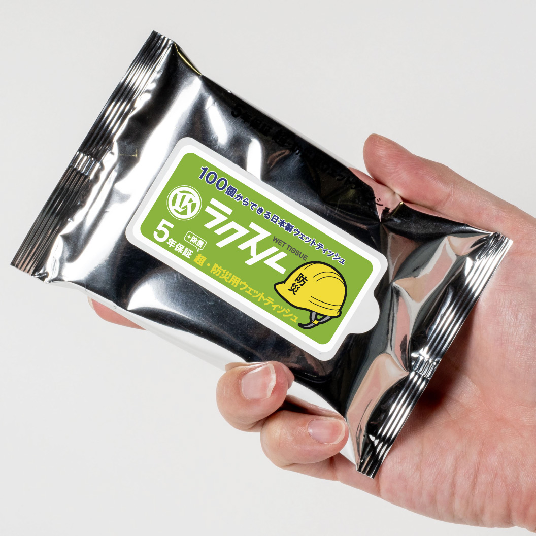 お問い合わせフォームはこちら100個からオリジナル製作が可能な防災用ウェットティッシュです。業界最長クラスの「5年保証」を実現。除菌効果を加えたウェットティッシュを防湿性に優れたアルミ蒸着フィルムで包装することで、製造から5年間安定した品質を保ちます。 防災用品としてはもちろん、家庭の常備品にもおすすめです。