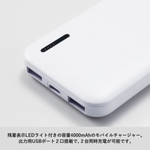デイリー使いにぴったりなモバイルチャージャーがお求めやすい価格で登場しました! 4000mAhとほどよい容量サイズなのがポイント。 側面には残量表示LEDライトがついており、簡単に残量の確認ができる仕様です。 また出力用USBポートは2口搭載されているため、2台同時充電も可能です。 4000・5000・10000mAhでご用意しており、用途やご予算にあわせてお選びいただけます。 PSEマークは本体側面にあるため、本体表裏に広く印刷範囲を取ることができ、企業グッズやイベントノベルティなど様々な案件にご提案いただけます。 ※ケーブルは付属しておりません。 ※本製品はUSB給電式です。