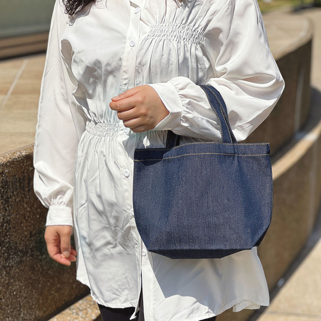 お問い合わせフォームはこちらシックなインディゴカラーにベージュのステッチをほどこしたファッショナブルなデニムシリーズです。 13オンスでタフなところもポイント! 定番の舟形デザインで使いやすい人気のデニムトートバッグです。 S・Mの2サイズ展開で、Sサイズはランチトートとして、またはちょっとしたお出かけなどにもちょうど良いサイズ感です。 使い勝手のよいミニトートは、ノベルティとしても大人気のアイテムです。 単色印刷はもちろん、フルカラー印刷も可能なためオリジナルロゴやキャラクターを入れた物販品としてもご提案いただけます。