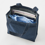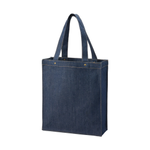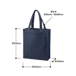 お問い合わせフォームはこちらシックなインディゴカラーにベージュのステッチをほどこしたファッショナブルなデニムシリーズです。 13オンスでタフなところもポイント! トレンド感のあるスクエア型デニムトートバッグです。 ハンドル部分についたアンティークゴールドのスタッズがポイントです。 A4が入るサイズ感かつ、肩掛けもできるのでデイリーユースにもぴったりです。 また外ステッチをほどこしており、角ばったフォルムを引き立ててくれます。 単色印刷はもちろん、フルカラー印刷も可能なため オリジナルロゴやキャラクターを入れた物販品やノベルティ、購入特典としてもご提案いただけます。