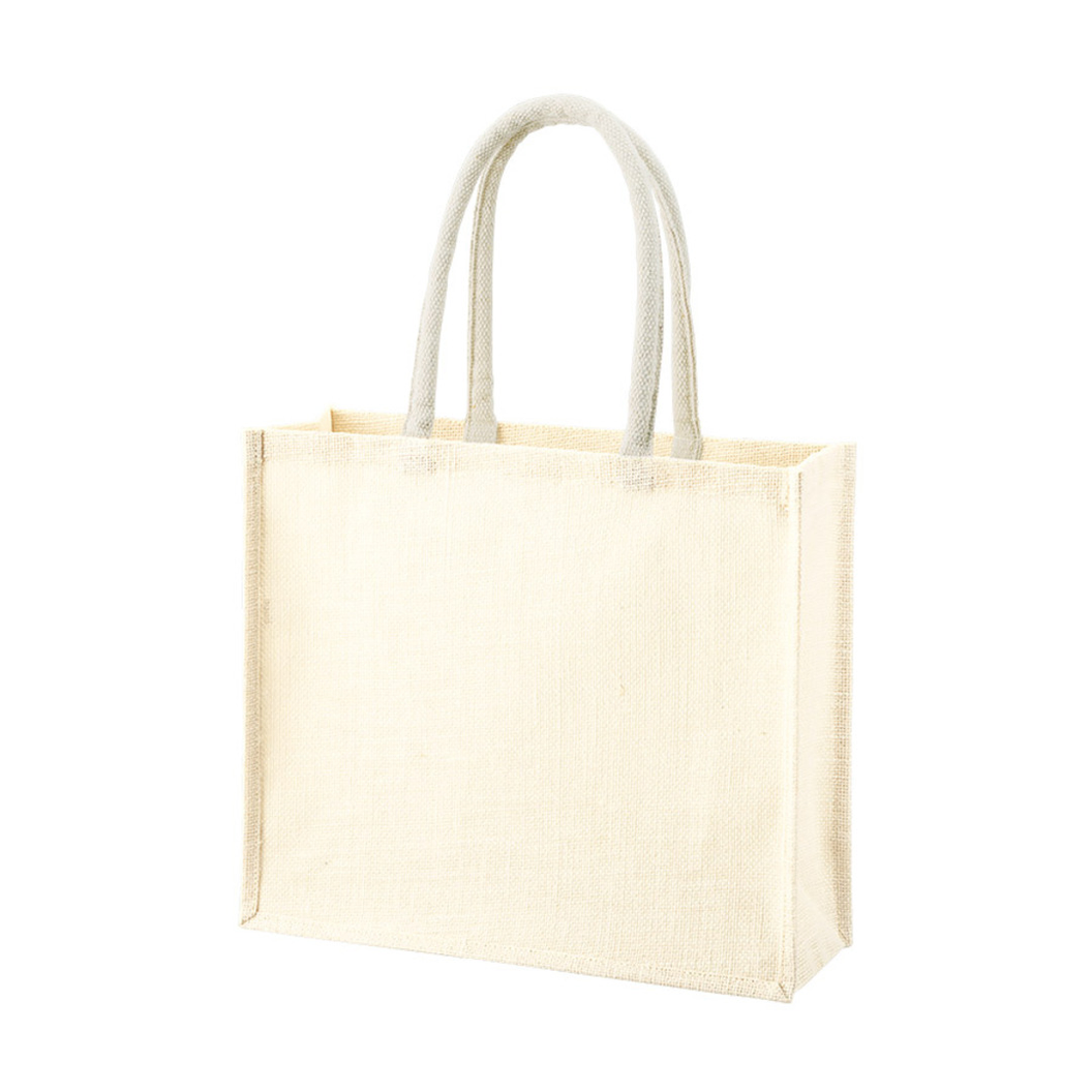 お問い合わせフォームはこちら大人気ジュートシリーズのA4サイズトートバッグです。 用途やお好みでお選びいただけるタテ型・ヨコ型の2タイプでご用意いたしました。 A4サイズ書類や500mlペットボトルなど荷物をしっかりといれることができるサイズ感です。 ハンドルは肩掛けができる便利な長さで、お出かけやお買い物バッグとしてもぴったりです。 単色印刷はもちろん、フルカラー印刷も可能なためアパレルショップのノベルティや購入特典、食料品店の販促品など<br> 天然素材を生かして幅広くご提案していただけます。