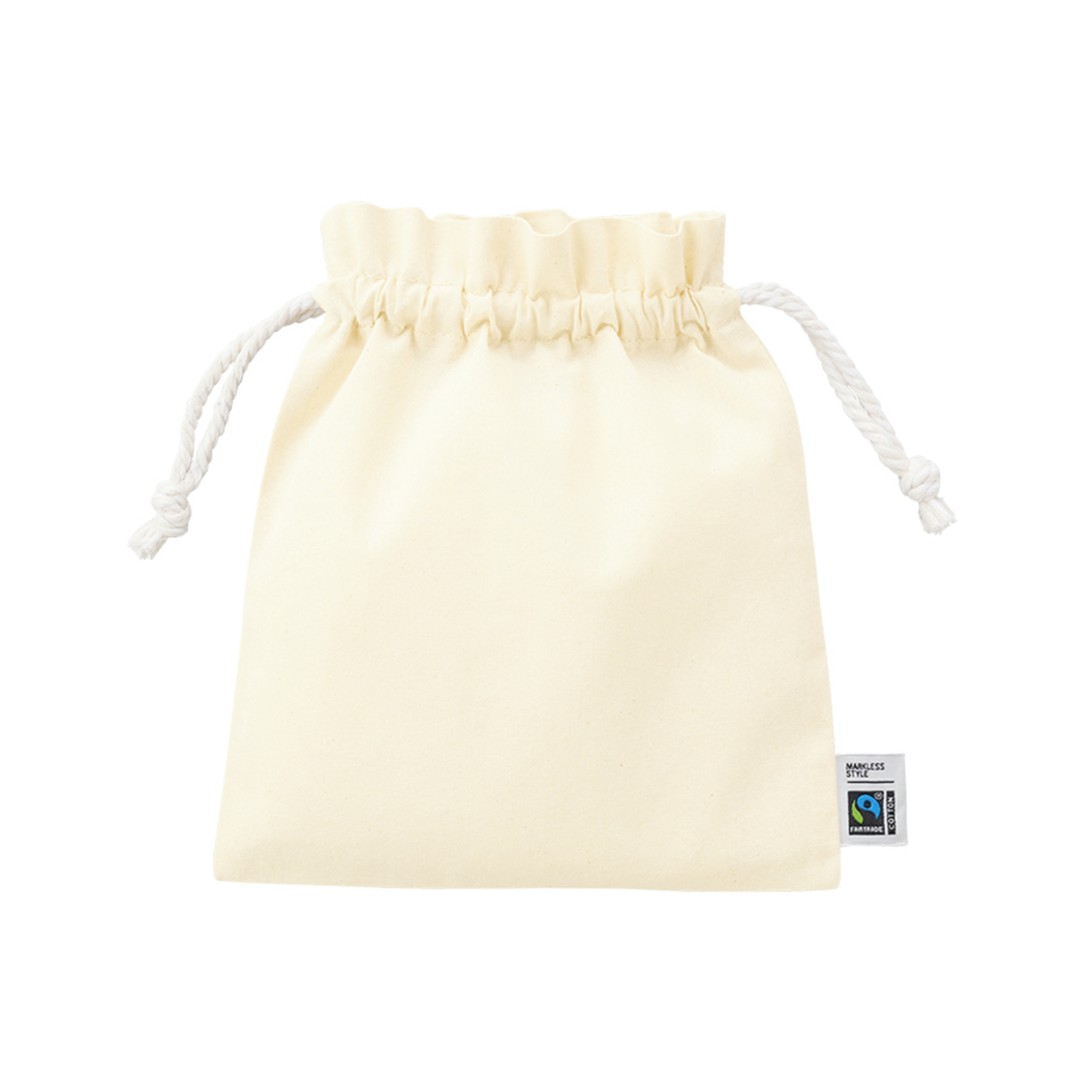 お問い合わせフォームはこちらフェアトレードコットンを使用した巾着です。 人気のフリル型は、シンプルながら口元の立ち上がりが華やかな印象で、 ねじったロープタイプの紐もポイントです。 生地、紐、全ての素材にフェアトレード認証のオーガニックコットンを使用しています。 S・Mの2サイズ展開で、Mサイズはギフト包装として食品などの商品を入れるのもおすすめです。 また単色印刷はもちろん、フルカラー印刷も可能なためギフト包装用の巾着やオリジナルノベルティのほか、 SDGs関連のキャンペーン販促品やフェアトレード関連フードの案件など 素材の特性を生かした案件などにご提案いただけます。 ▼フェアトレードとは? フェアトレードとは発展途上国の原料や製品を適正な価格で購入することで、そのような国の人々の生活改善や自立を支援する活動です。 当製品に使用されているコットンもフェアトレード認証生産者から基準に従って調達された認証コットンです。 ▼国際フェアトレード認証コットンラベルとは? 国際フェアトレード認証ラベルは、その原料が生産されてから、輸出入、加工、製造工程を経て「国際フェアトレード認証製品」として完成品となるまでの各工程で、国際フェアトレードラベル機構(Fairtrade International)が定めた国際フェアトレード基準が守られていることを証明するラベルです。< つまり、この商品はフェアトレードだという証明書や目印のような役割をしています。