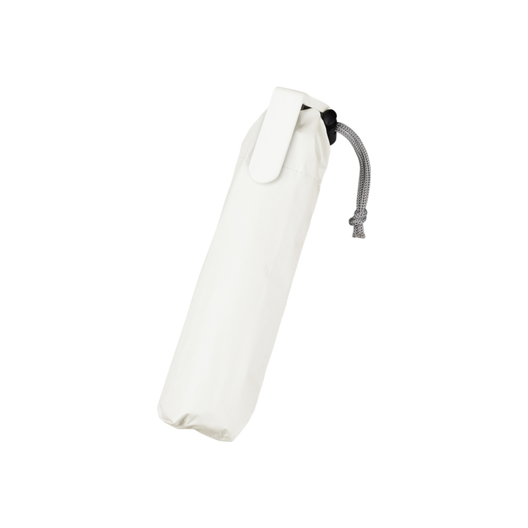 お問い合わせフォームはこちら遮光率100%、UVカット率100%、UPF評価50+、撥水加工生地使用! 約160gと軽量かつスリムボディで、クリップ形状ハンドルが特徴の遮光折りたたみ傘です。 クリップ部分をバッグなどに掛けて持ち運ぶことができ、またハンドルの内側には滑り止めもついているため、テーブルなどにひっかけることもできます。 さらに石突の面積を大きくしたことで自立も可能です。 巾着型の傘袋はストッパー付きなので紛失の心配もありません。 クリップ部分は全面フルカラー印刷が可能なため販促効果もばっちりです。 傘本体パネル、傘袋、幅広のベルトにもそれぞれ印刷が可能で、オリジナリティの高いアイテムをご提案いただけます。