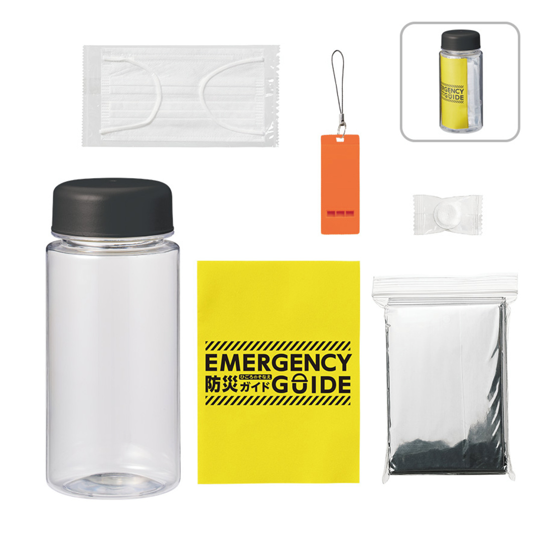お問い合わせフォームはこちら被災時に必要なものがぴったりと入った、コンパクトな防災ボトルセットです。 ボトル側面に黄色の防災ガイドやオレンジの薄型ホイッスルが見えるので バッグや棚にしまっておいても目立つやすく、必要なときにすぐに見つけることができます。 ボトルに名入れが可能でオリジナル備品やグッズとして、また防災キャンペーンにもご提案いただけます。