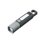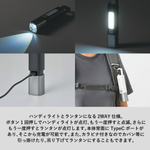 お問い合わせフォームはこちらハンディライトとランタンになる2WAY仕様のLEDライトです。 ボタンを1回押すとハンディライトが点灯、もう一度押すと点滅、さらにもう一度押すことで側面のLEDが点灯します。 また充電式で、本体背面のtype-Cポートから充電が可能です。 ハンディライトの照射方法は2モードから選択可能で、ハンディライトの状態でシルバー部分を伸ばすと遠くを集中的に照らす「スポットモード」に、シルバー部分を収めると広範囲を照らす「ワイドモード」に切り替えることができます。 さらに本体上部にはカラビナがついており、カバンなど引っ掛けたり吊り下げてランタンにするのもおすすめです。 防災キャンペーンのオリジナルグッズや、社内の防災備品などにご提案いただけます。