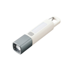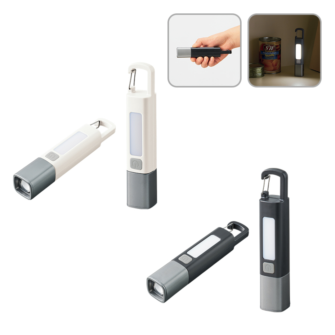 お問い合わせフォームはこちらハンディライトとランタンになる2WAY仕様のLEDライトです。 ボタンを1回押すとハンディライトが点灯、もう一度押すと点滅、さらにもう一度押すことで側面のLEDが点灯します。 また充電式で、本体背面のtype-Cポートから充電が可能です。 ハンディライトの照射方法は2モードから選択可能で、ハンディライトの状態でシルバー部分を伸ばすと遠くを集中的に照らす「スポットモード」に、シルバー部分を収めると広範囲を照らす「ワイドモード」に切り替えることができます。 さらに本体上部にはカラビナがついており、カバンなど引っ掛けたり吊り下げてランタンにするのもおすすめです。 防災キャンペーンのオリジナルグッズや、社内の防災備品などにご提案いただけます。