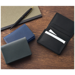 再生合皮を使用した高級感のあるシボ柄が特徴的なレザー調カードケースです。本革に近い質感を手軽に楽しめるのがポイントです。名刺は55毎まで収納可能です。