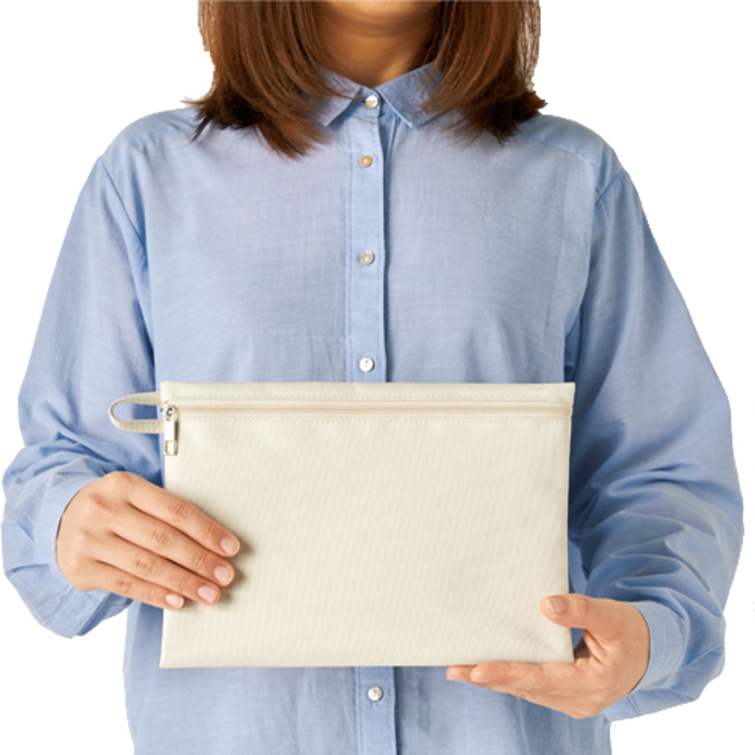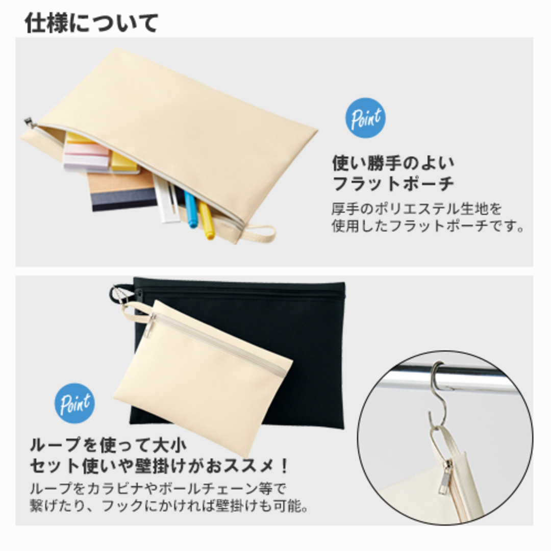 お問い合わせフォームはこちらユーティリティフラットポーチ(M)は、厚手のポリエステルを使用した、ループ付きのマチなしポーチです。 本体サイズは縦260mm×横180mmで、8.3インチタブレットや長財布、文庫本などを収納できます。 本体色は、ミルキーベージュ・ネイビーブルー・インクブラックの3色展開です。 ファスナー横のループには、カラビナやボールチェーンなどを取り付けることができます。