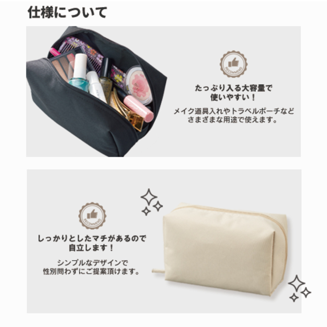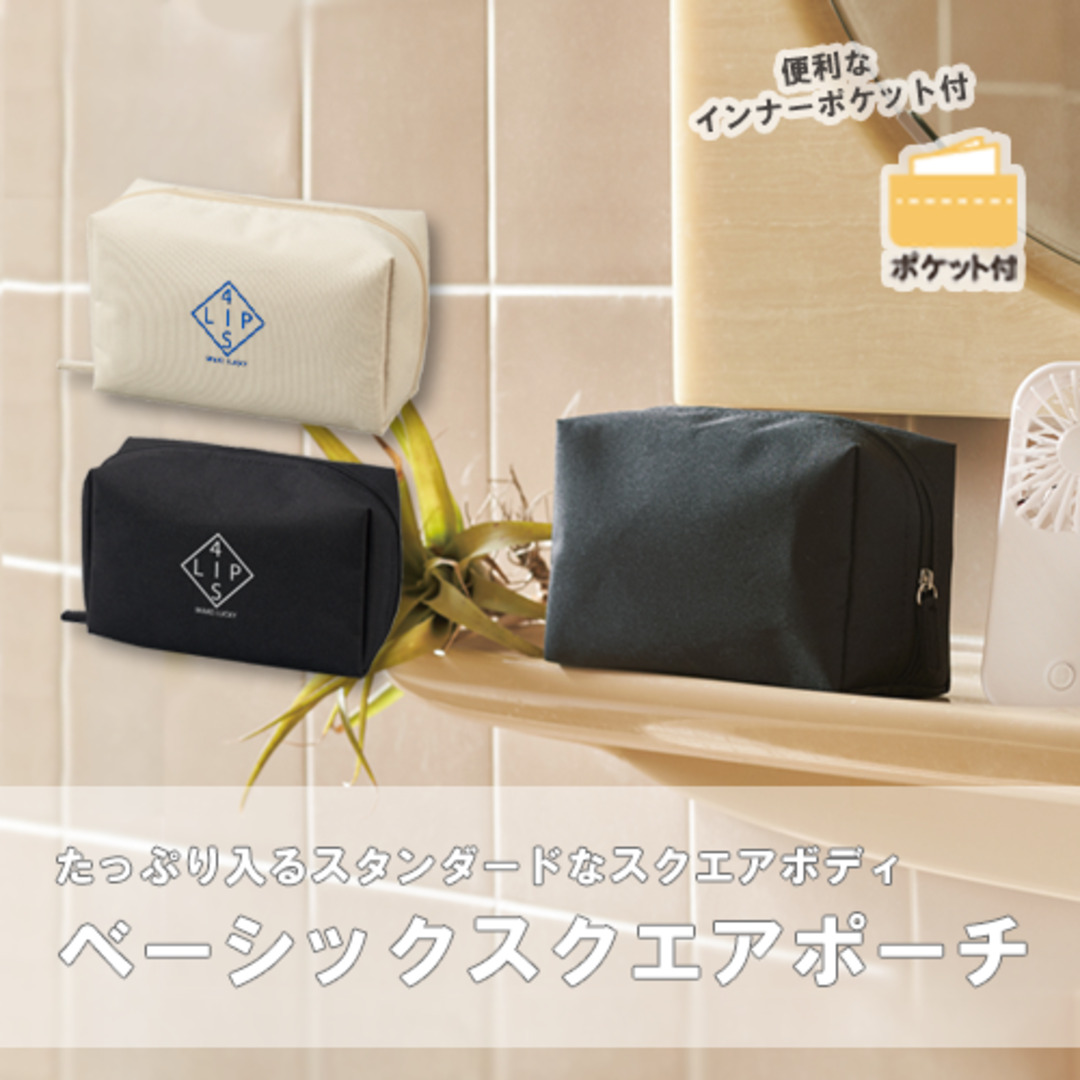 お問い合わせフォームはこちらベーシックスクエアポーチは、ポリエステルを使用し、内側ポケットと広めのマチにより大容量のポーチです。 本体サイズは縦100mm×横170mm×マチ70mmで、コスメグッズやトラベル用の小物などを収納できます。 本体色は、ミルキーベージュ・インクブラックの2色展開です。 コの字型のファスナー仕様で、中身の出し入れがしやすくなっています。